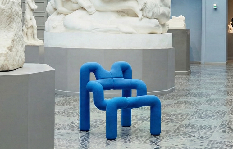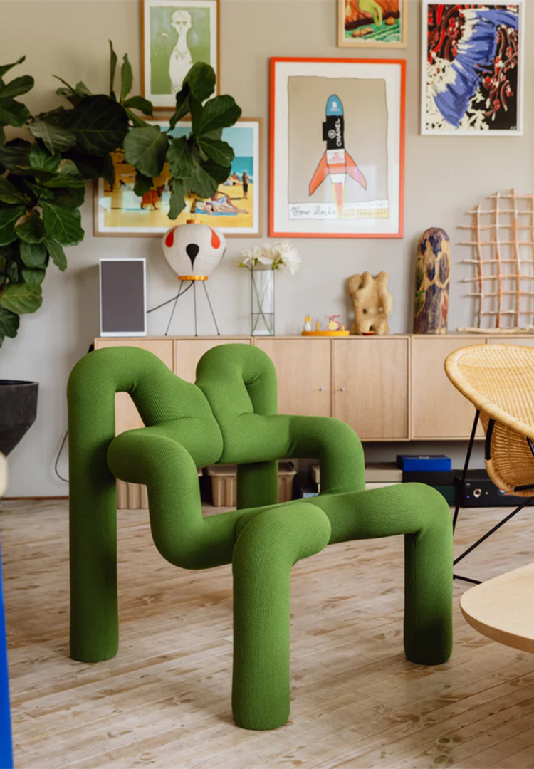 Ekstrem appears like a graphic object in the room, its clean lines and idiosyncratic formal language immediately marking it out as a postmodern design icon. The seamlessly knitted wool cover fits precisely over the curved form, making it tangible as a visible, textile architecture.