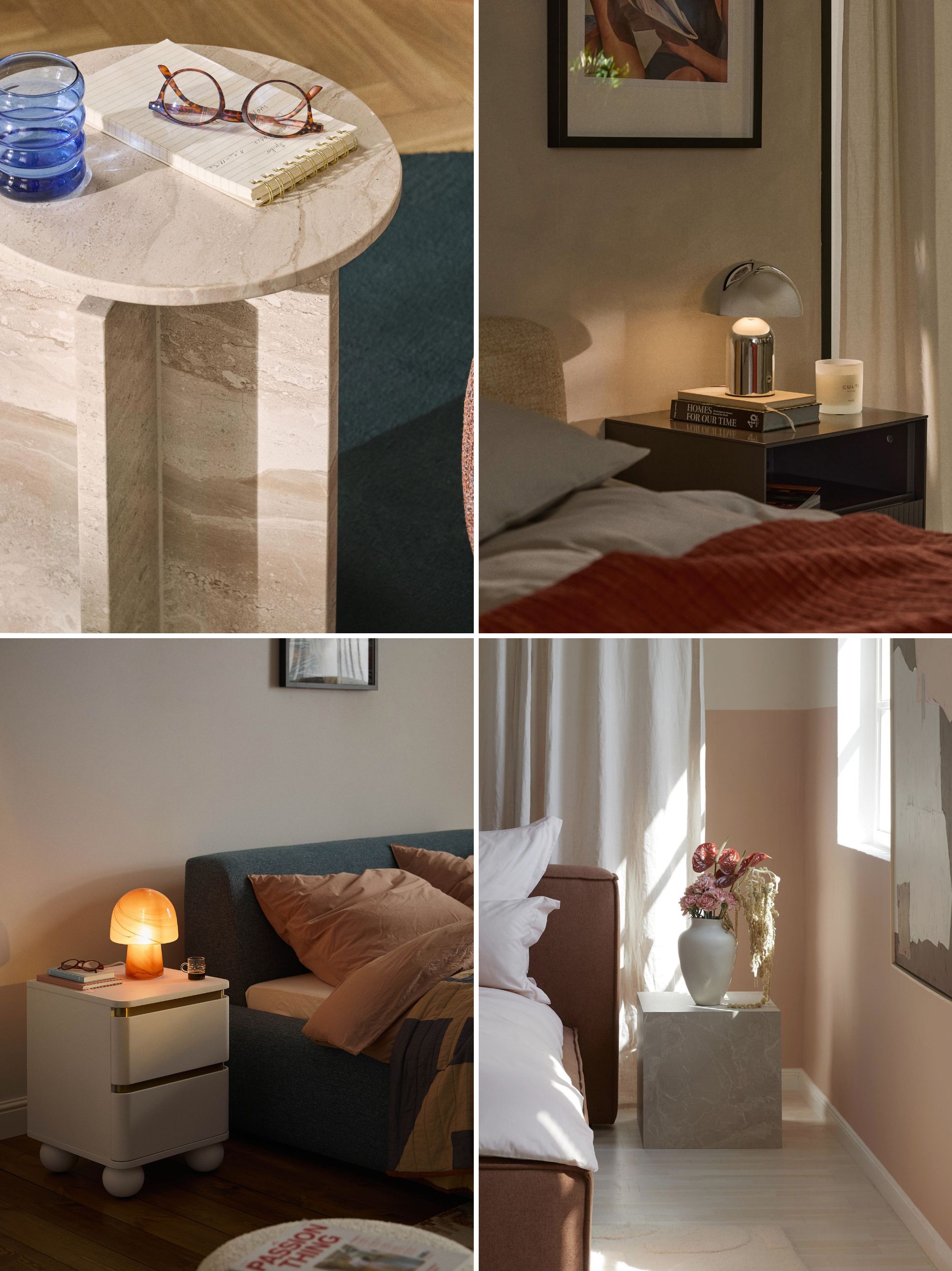 Side tables double as nightstands and bring a sense of structure to the room. A small table lamp adds warm, soft light and helps create a peaceful atmosphere.
