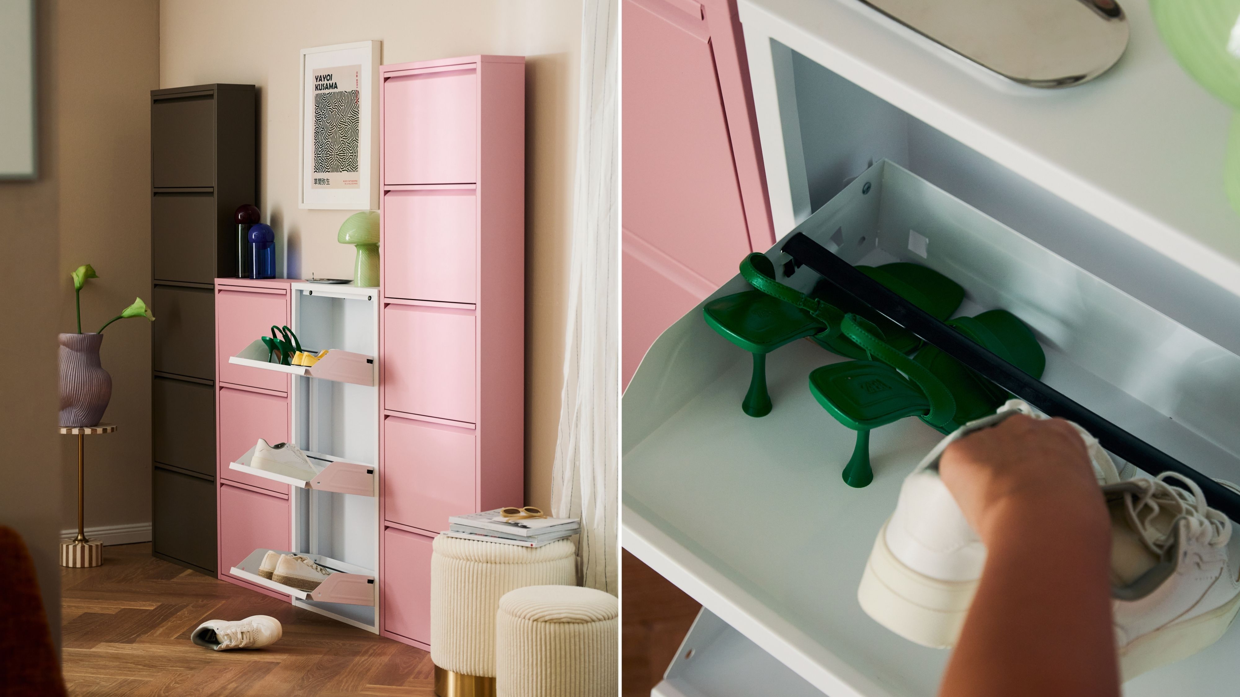 Bestseller CARUSO is the best proof. This compact shoe cabinet combines clean lines with either subtle or bold colors. Behind its flip-down compartments, everything that makes a hallway look cluttered disappears in style. Also a great idea as smart storage in the living room — especially in small apartments.