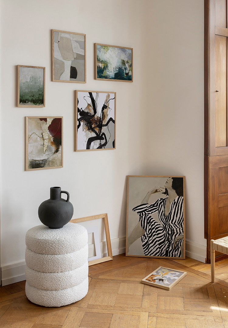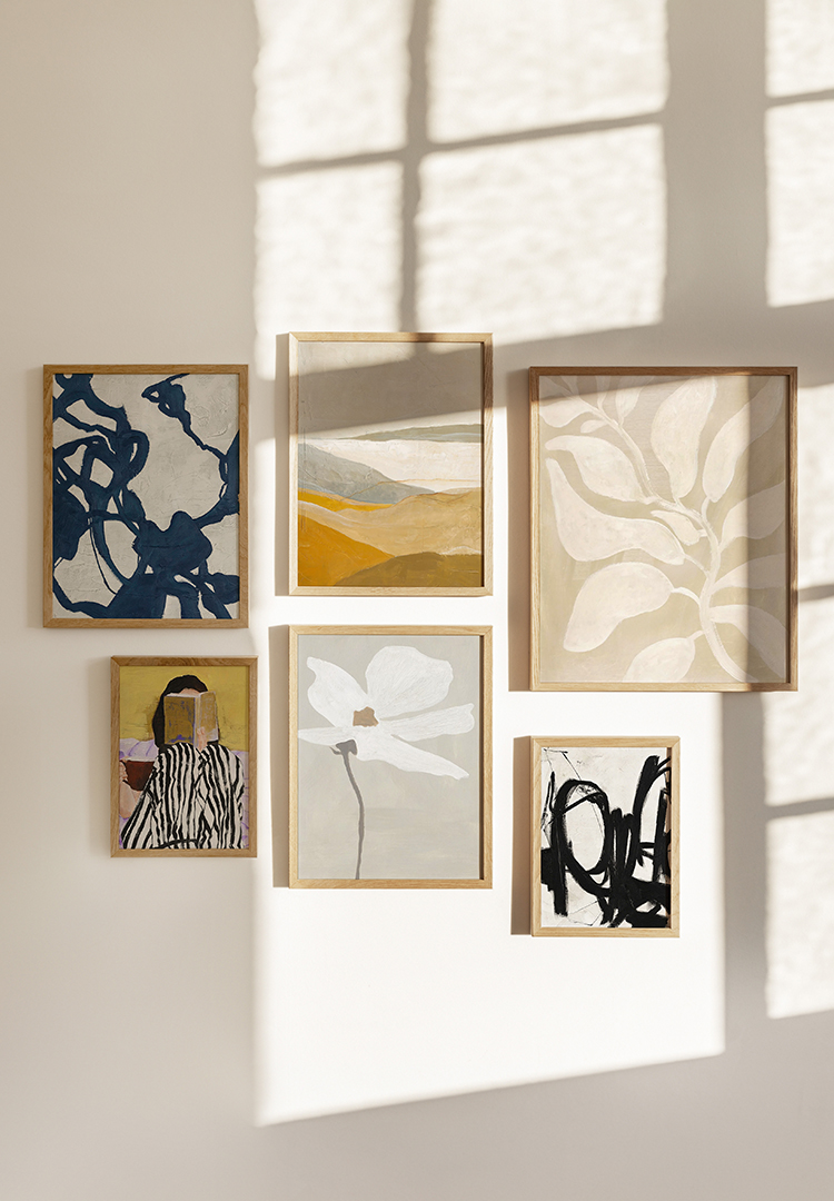 Tip: Lay the pictures out on the floor first and, before hammering, mark the frame sizes on the wall with tape.