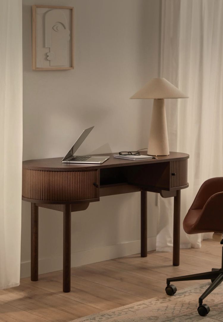 Desk CALARY – made from FSC®-certified wood, it features practical sliding fronts with a ribbed design. Perfect for keeping documents organised and your workspace clean.
