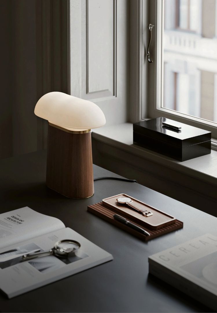 Sculptural statement! Table lamp NOVA combines an airy glass shade with a solid walnut base and elegant brass detail. Ideal for adding both essential lighting and a design accent to any desk.