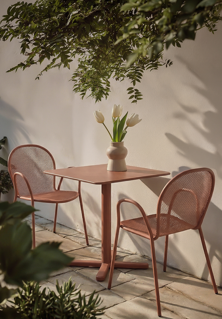 The stackable armchair RONDA impresses with an ergonomic shape and a honeycomb-style seat. Its structure plays with the light and creates elegant shadow effects. Plus, the folding table DARWIN – clean, practical, perfect for small dining spots.