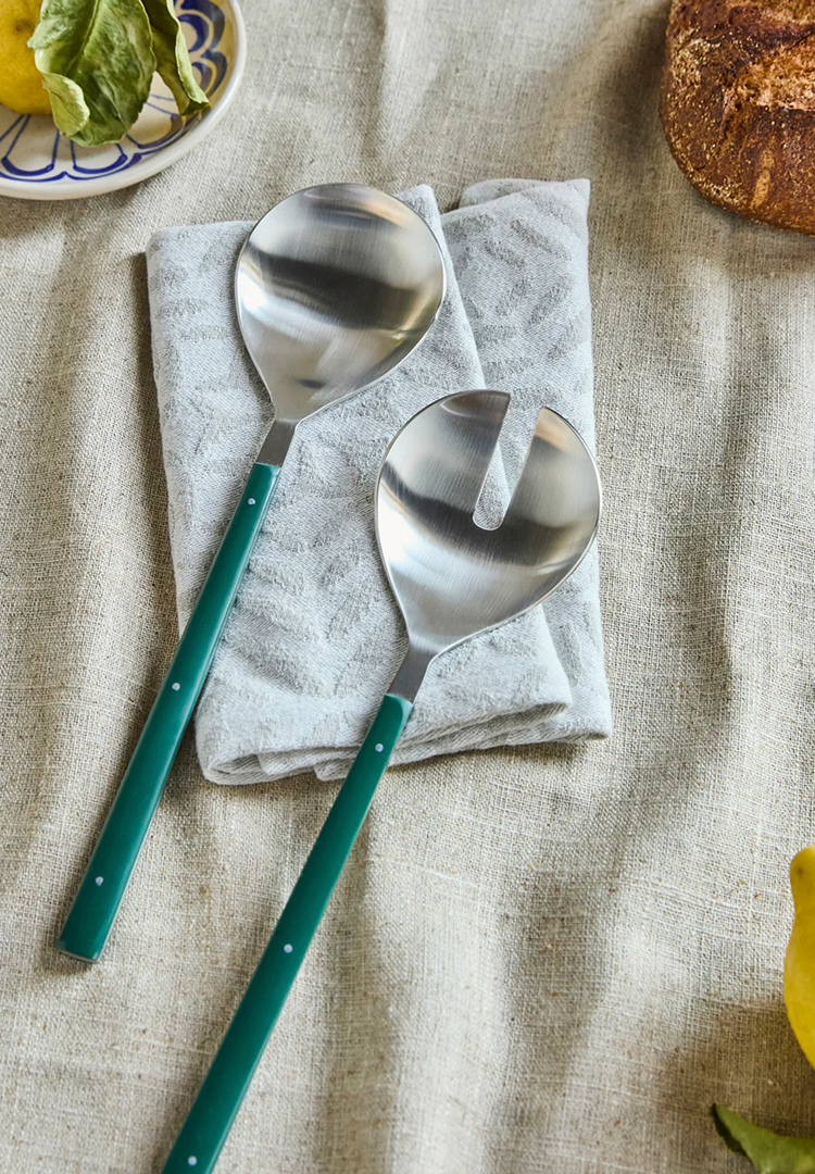 The handcrafted LATA salad servers by House Doctor, made from polished stainless steel and finished with dark green handles, bring modern elegance to the dining table.